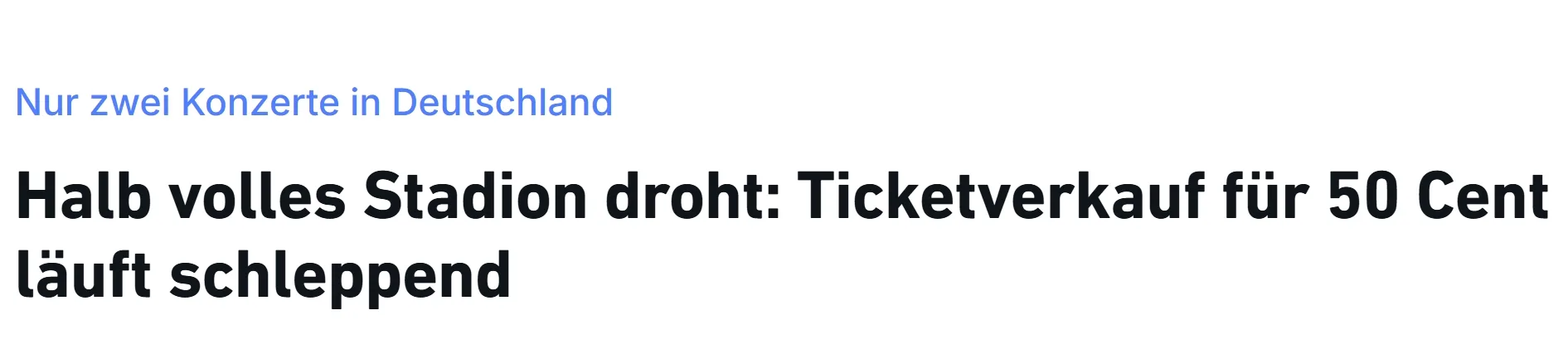 Geplant ist, dass 50 Cent am Samstag den 28. Juni in der Heinz von Heiden-Arena in Hanover auftritt. Zwei Tage vor dem Konzert sind die Tickets in den allermeisten Kategorien aber noch verfügbar. Selbst Kollegah, der kürzlich einen Auftritt bei „Erkenne den Song“ hatte, deutete an, sich über die schleppenden Verkäufe und die vergleichsweise günstigen Preise für das Konzert von 50 Cent lustig zu machen.