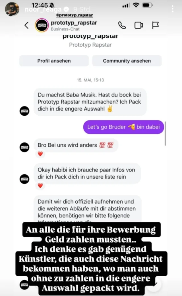 Wie Noor Reaga mitteilt, hat er die Beschwerben seiner Mitbewerber mitbekommen und sich mehr Professionalität von einem großangelegten Format wie Prototyp Rapstar erwartet. Er legt zudem einen Chatverlauf mit den Verantwortlichen der Show offen, in dem es offenbar zu einer Art Vetternwirtschaft, bzw. Bevorzugung gekommen ist.