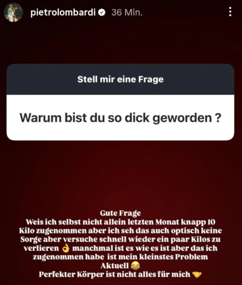 Das hat auch er selbst bemerkt und erklärt, dass er innerhalb weniger Wochen gut 10 Kilo zugenommen hat. Er verspricht jedoch, sich trotz seiner Situation nicht hängen zu lassen und ab sofort wieder auf sein Gewicht zu achten, auch wenn sein Körper derzeit sein „kleinstes Problem“ sei.