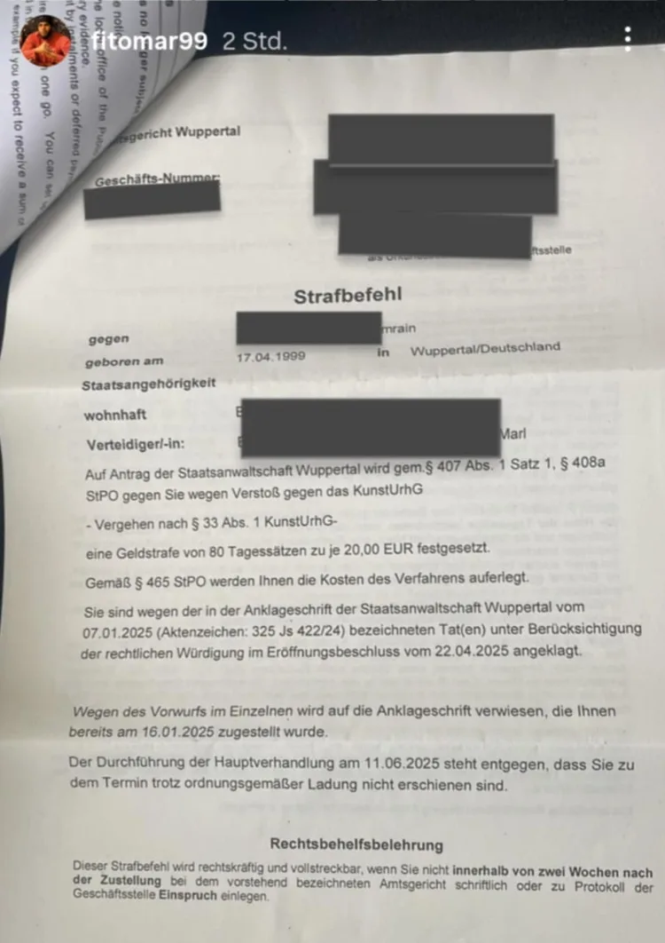 Jetzt hat Fat Comedy die nächste Geldstafe kassiert. Diesmal scheint es aber nicht unmittelbar um die Ohrfeige gegen Pocher zu gehen, sondern um einen anderen Verstoß. Laut Strafbefehl, den der Influencer veröffentlicht hat, hat er gegen Paragraph 33 des Kunsturhebergesetzes verstoßen.