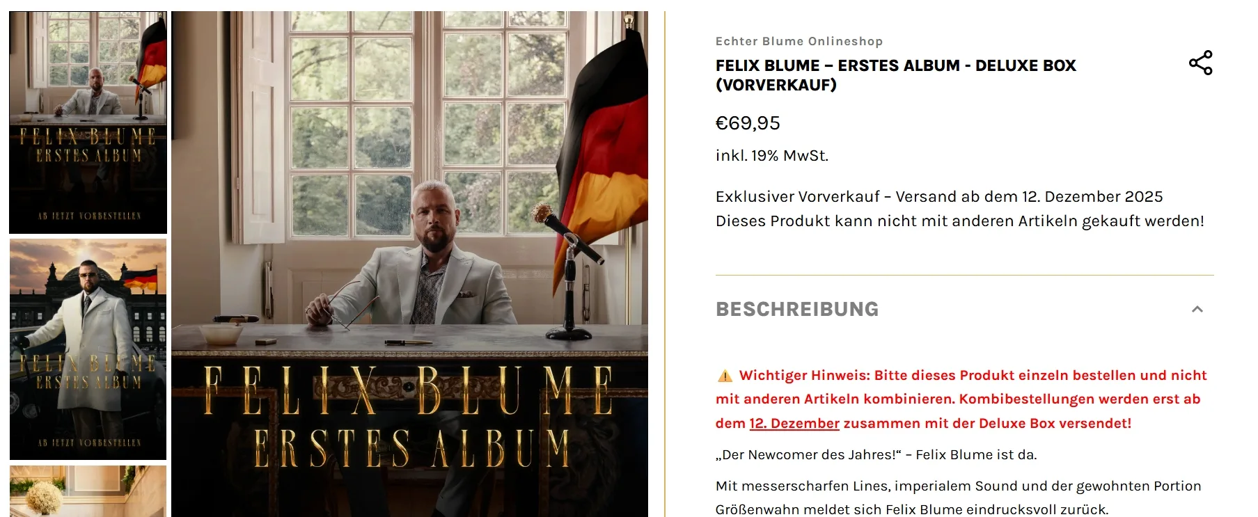 „Mit messerscharfen Lines, imperialem Sound und der gewohnten Portion Größenwahn meldet sich Felix Blume eindrucksvoll zurück. Die streng limitierte Deluxe Box enthält, bislang unveröffentlichte Songs - direkt aus dem Boss-Lab.“