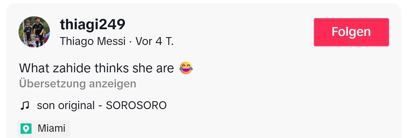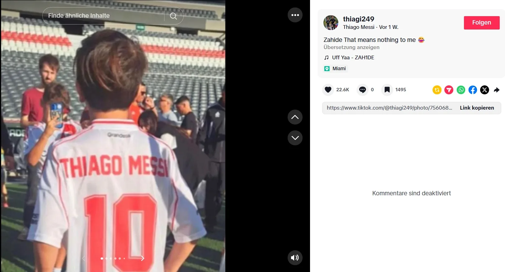 Jetzt hat es die erste Reaktion von Thiago Messi zur Erwähnung durch Zahide gegeben. Und zwar gleich doppelt. Vor gut einer Woche teilte der Messi-Sohn das erste Tiktok, in dem er den Diss-Song von Zahide als Sound verwendet und dazu schreibt, dass der Diss und die Erwähnung ihm nichts bedeuten würden: „Zahide, das bedeutet nichts für mich“