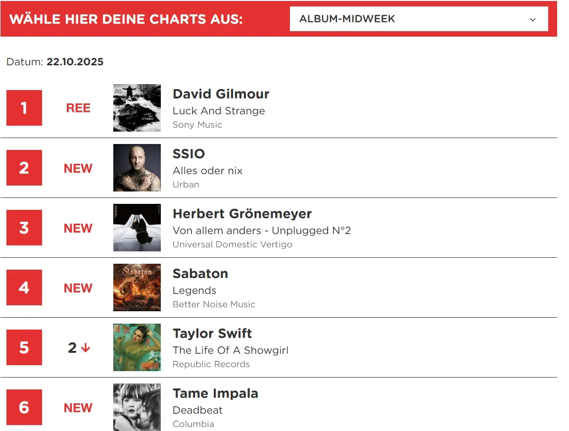 Grund für den 2. Rang ist der britische Künstler David Gilmour und dessen Album „Luck and Strange“. Dieses wurde ursprünglich im Jahr 2024 released und war zuletzt im Januar 2025 in den Albumcharts. Exakt in derselben Woche wie „Alles oder Nix“ wurde jedoch eine Deluxe-Version des Albums released, wodurch er anscheinend mehr Umsatz gemacht hat, als SSIO in seiner gesamten Promophase.