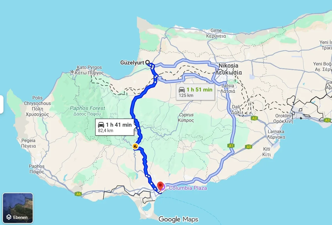 Somit ist klar, dass sich die Villa im Norden, an der nach Westen gerichteten Küste befindet. Dort liegt bspw. die Stadt Morfou, bzw. Güzelyurt, im türkischen Teil Nordzyperns mit knapp 20.000 Einwohnern. Ansonsten liegen einige kleine Dörfer an derselben Küste. Damit sind Fler und Pa Sports also keine direkten Nachbarn, sondern gut 70 Kilometer Luftlinie, bzw. 1,5 Stunden Autofahrt voneinander entfernt. Dass sie sich dort zufällig über den Weg laufen, ist also nicht unbedingt wahrscheinlich, wenn auch nicht ausgeschlossen.