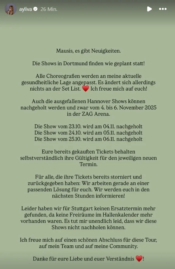 Die Konzerte in der ZAG Arena finden nun am 4. bis 6. November 2025 statt. Bereits gekaufte Tickets behalten somit ihre Gültigkeit. Wenn ihr euer Ticket bereits storniert habt, solltet ihr in den kommenden Stunden die Social Media-Kanäle von Ayliva im Aug behalten. Sie verspricht eine Lösung für diejenigen, die doch noch zum Nachholtermin kommen wollen. Für Stuttgart hingegen gibt es keine so guten Nachrichten. Die Konzert-Venue hat keine freien Termine mehr, sodass es keine Nachholkonzerte gibt.