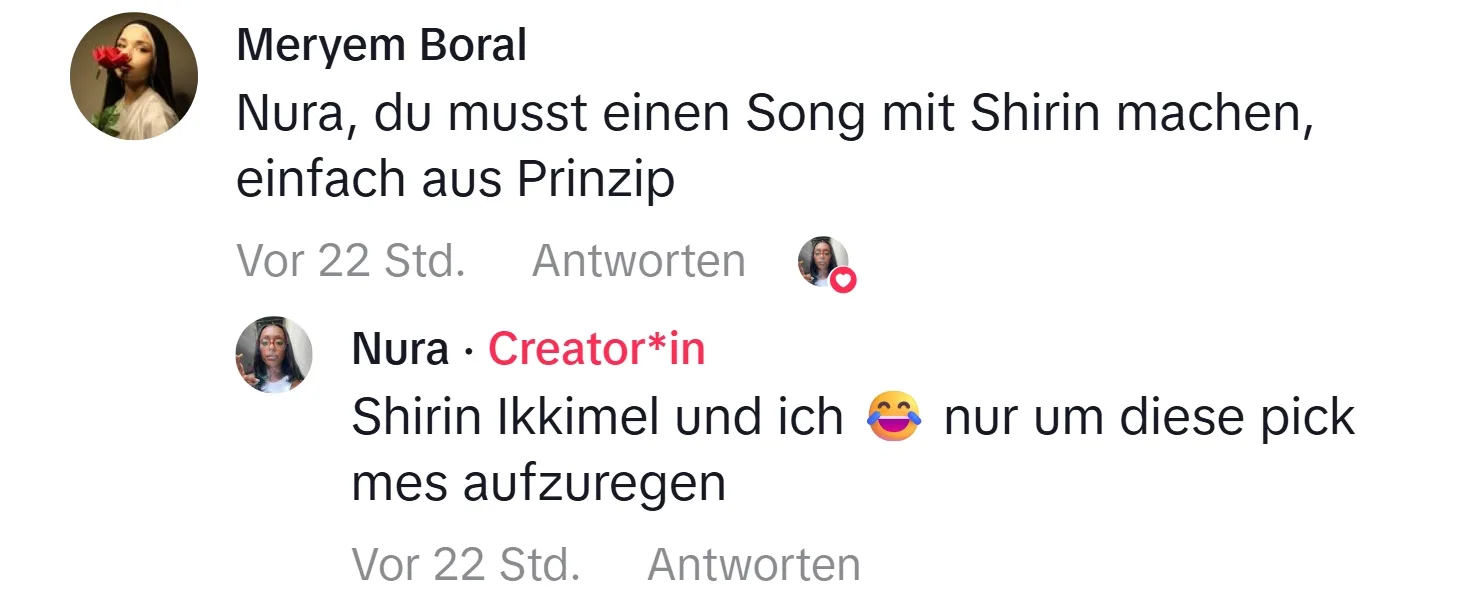 Sie schlägt deshalb vor, dass Ikkimel, Shirin David und sie einen gemeinsamen Song machen sollten, nur um ihren Konkurrentinnen eins auszuwischen. Dass Ikkimel und Nura sich bestens verstehen, ist bereits bekannt. So trat Nura erst kürzlich als Special Guest beim Ikkimel Open Air auf. Wie gut der Draht zu Shirin David ist, ist unklar. Getreu dem Motto „Der Feind meines Feindes, ist mein Freund“, würde diese Konstellation aber definitiv Sinn ergeben…