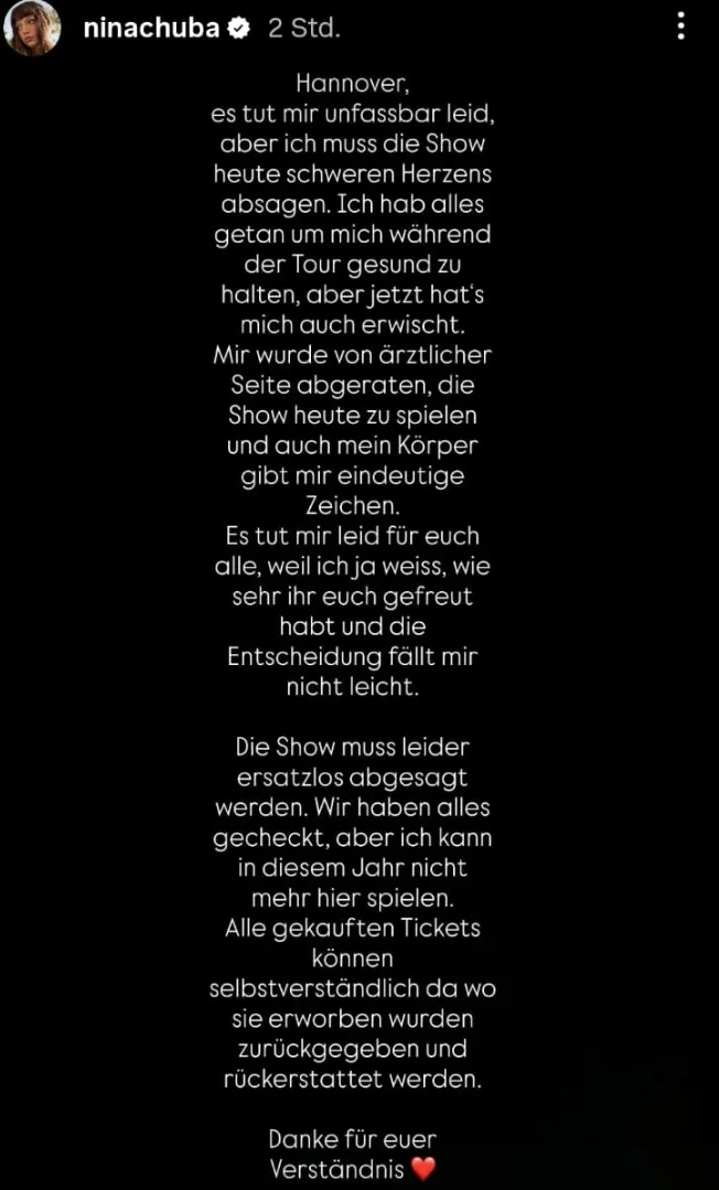 Nur Tage nach den Hannover-Fiaskos von Samra und Ayliva folgt nun die nächste Rapperin, die es ausgerechnet in der Großstadt an der Leine trifft. Etwa 5 Stunden vor dem geplanten Beginn des Auftritts hat Nina Chuba ihren Tourstopp in Hannover abgesagt. Sie schafft es gesundheitlich nicht mehr, den Gig zu spielen.