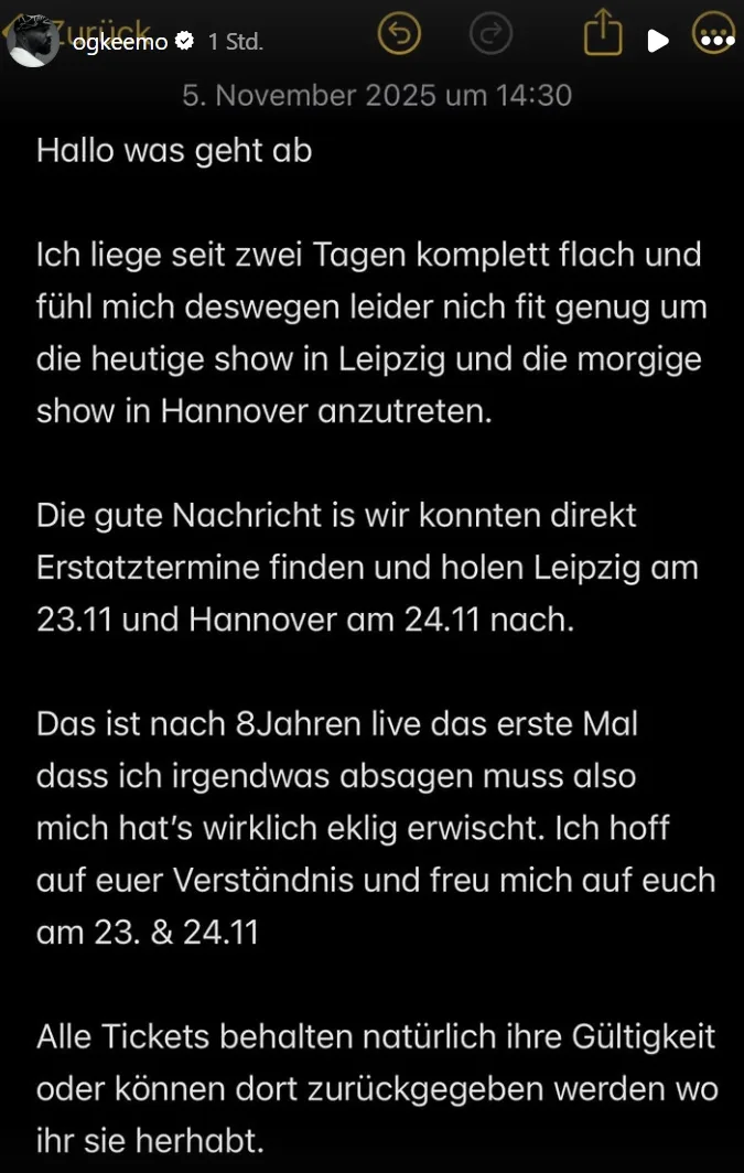 Und der Seuchenherbst für Hannover ist noch immer nicht vorbei. Vor wenigen Minuten hat OG Keemo mitgeteilt, dass er sowohl in Leipzig, als auch in Hannover nicht auftreten kann. In seinen gesamten 8 Jahren als aktiver Rapper muss er zum ersten Mal überhaupt Auftritte absagen.