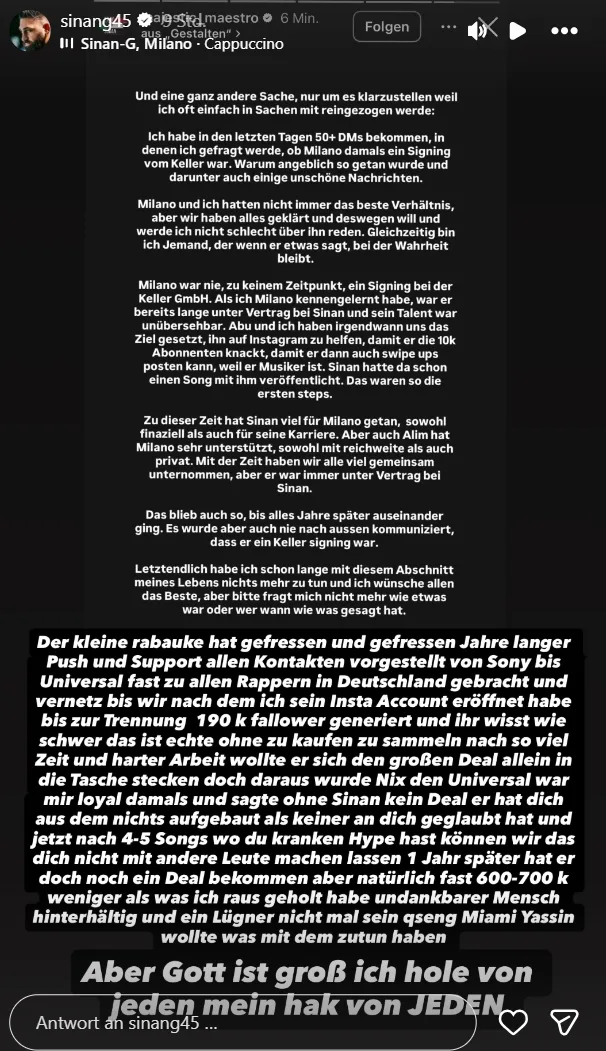 Gut 5 Jahre später will sich der Essener nun offenbar seinen berechtigten Anteil zurückholen. Er reagiert auf ein langes Statement von Maestro, der damals ebenfalls um Umfeld von Sinan gewesen ist und hautnah miterlebt hat, wie sehr man dabei mitgeholfen hat, Milano bekannt zu machen und aufzubauen. Er stimmt der Darstellung zu, dass Sinan-G eine Menge Zeit, Geld und Kontakte in den damaligen Newcomer investiert hat.