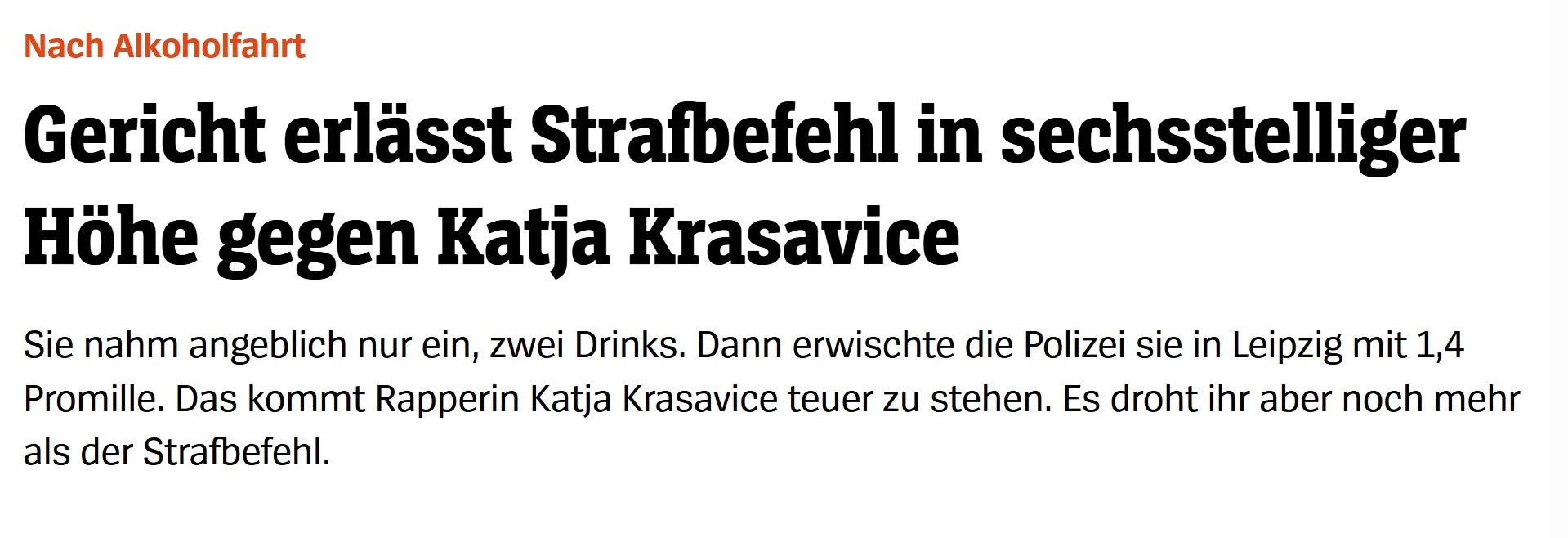 In der Nacht auf den 29. Mai wurde Katja Krasavice völlig besoffen am Steuer erwischt. Auf dem Rückweg von einer Privatparty bei ihrer Freundin wurde die 29-Jährige von der Polizei angehalten und ein Blutalkoholwert von 1,4 Promille bei ihr gemessen. Damit galt die Rapperin, die im Stadtteil Leipzig-Südwest unterwegs war, als absolut fahruntüchtig.