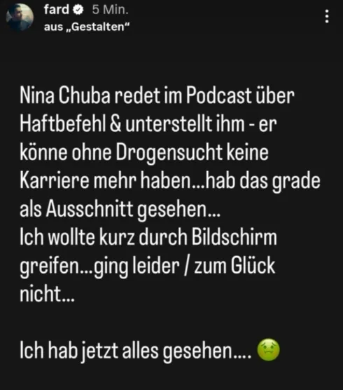 „Nina Chuba redet im Podcast über Haftbefehl und unterstellt ihm, er könne ohne Drogensucht keine Karriere mehr haben… hab das gerade als Ausschnitt gesehen. Ich wollte kurz durch den Bildschirm greifen… ging leider (zum Glück) nicht. Ich hab jetzt alles gesehen…“