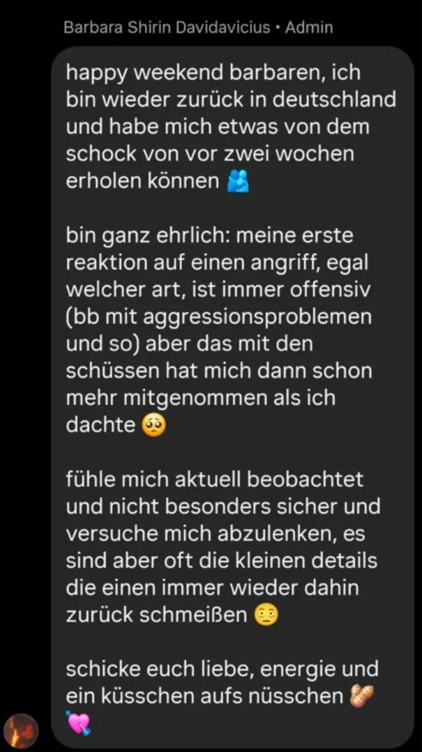 Anfang November wurden Shirin David und ihr Team zum Opfer eines gezielten Angriffs. In ihren ersten Reaktionen auf die Schüsse zeigte sich die 30-Jährige noch betont unbeeindruckt und ließ über ihr Team verlautbaren, sich nicht äußern zu wollen.