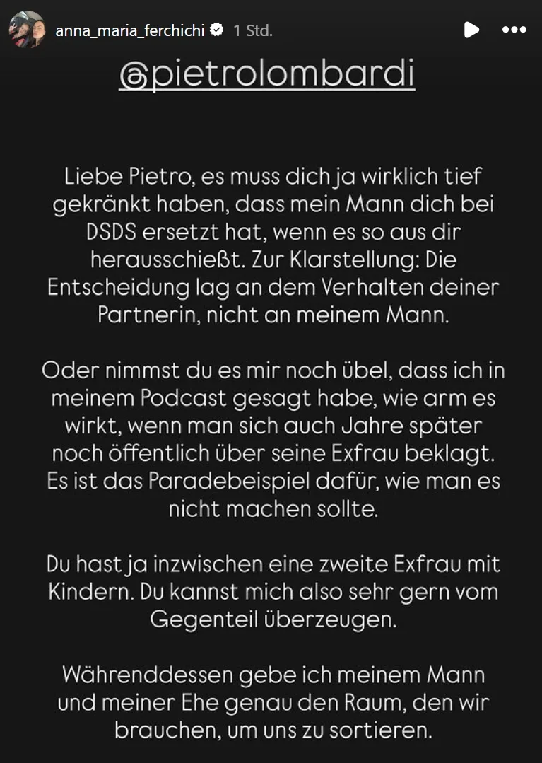 Vor wenigen Augenblicken hat Anna-Maria Ferchichi nun mit einem Gegenstatement auf die Worte von Pietro reagiert. Und während der Sänger seinen Post noch relativ positiv formulierte, teilt die 44-Jährige hemmungslos aus. So wirft sie ihm vor, „gekränkt“ darüber zu sein, dass Bushido ihn bei DSDS ersetzt hat. Bushido hat in der kommenden DSDS-Staffel den Platz eingenommen, den Pietro Lombardi zuvor inne hatte.