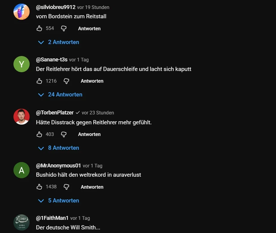 Das ist die mit Abstand schlechteste Bewertung, die er seit der Erstellung seines Kanals im Jahr 2005 jemals erhalten hat. Und auch in den Kommentaren werden der Song und das dazugehörige Musikvideo regelrecht verrisen. Das verrät ein Blick in die Topkommentare. Selbst wenn man hunderte Kommentare nach unten scrollt, findet sich kaum positives Feedback. Zumindest schreiben einige Fans, dass die Bushido trotzallem weiterhin gerne hören.