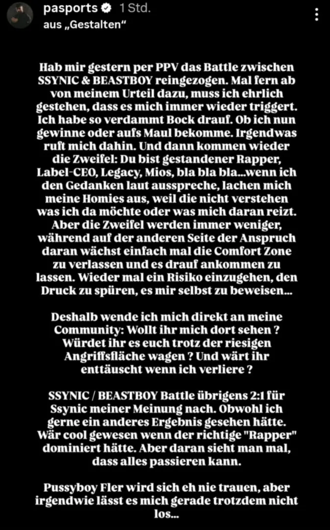 Das Battle zu sehen, hat auch noch einen anderen Effekt bei Pa Sports ausgelöst. Er kokettiert bereits seit Jahren mit dem Gedanken, wieder in die Battlerapszene einzusteigen. Sowohl er, als auch Fard gaben Ende 2023 an, womöglich ein Acapella-Match bei DLTLLY bestreiten zu wollen. Am Ende ist es bekanntermaßen nicht dazu gekommen. Trotzdem schließt Pa Sports eine Rückkehr zum Acapella-Battle nicht aus. Vor fast 20 Jahren bestritt er sein letztes bekanntes Battle bei Feuer über Deutschland 2. Jetzt wäre der perfekte Zeitpunkt, um sich dem Risiko erneut zu stellen: