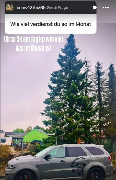 Im Zuge seiner aktuellen Fragerunde gibt Bonez MC an, dass er circa 3.000 Euro am Tag verdient, was 90.000 Euro im Monat verdient. Dies deckt sich mit den vorherigen Angaben, was in sich eine Bestätigung dafür ist, dass Bonez MC nicht einfach wahllos eine Zahl genannt hat, sondern sich an seinen tatsächlichen Einnahmen orientiert.