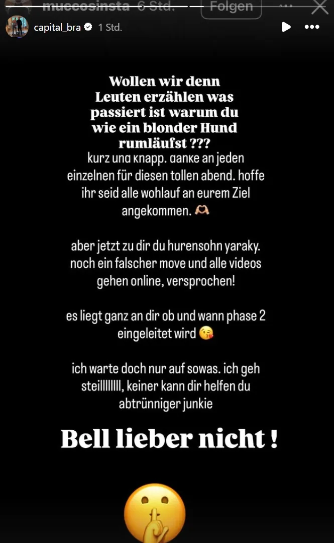 Angefangen hat die Eskalation vor rund einer Stunde, als Capital Bra auf eine vorherige Story von Mucco geantwortet hat. Darin schrieb Mucco in Richtung Yakary und drohte ihm damit, gewisse Videos online zu stellen, in denen Yakary vermutlich nicht besonders gut dastehen würde.