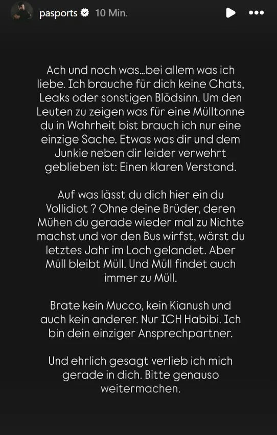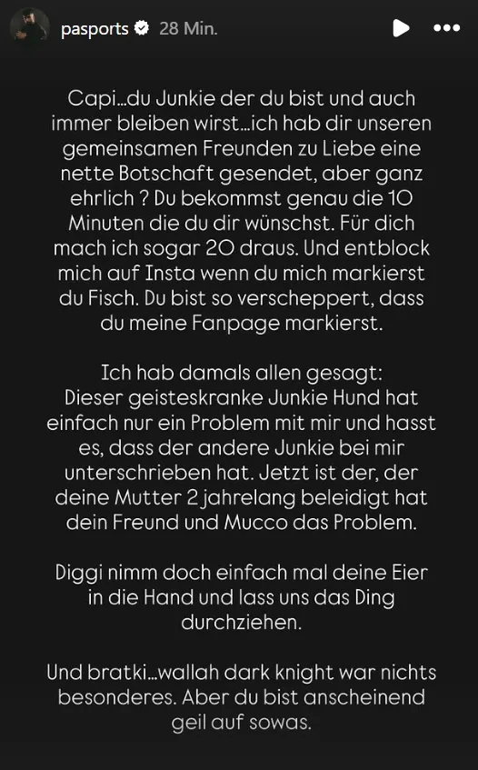 „Du bekommst genau die 10 Minuten, die du dir wünschst. Für dich mach ich sogar 20 draus. (…) Dieser geisteskranke Junkie-Hund hat einfach nur ein Problem mit mir und hasst es, dass der andere Junkie bei mir unterschrieben hat. Jetzt ist der, der deine Mutter 2 Jahre lang beleidigt hat dein Freund und Mucco das Problem.“