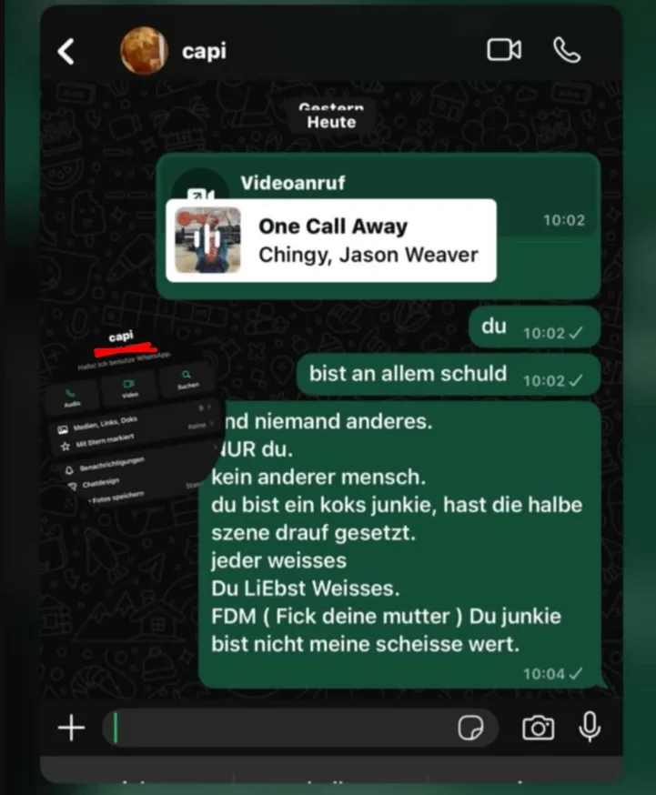 Jetzt hat Yakary wiederum auf die Abfuhr von Capital Bra reagiert und sich dazu entschlossen, sämtliche Brücken abzufackeln. Er enthüllt eine Whatsapp-Nachricht, die er heute Morgen an den Bratan geschrieben hat. Dort beleidigt er Capi als „Koks-Junkie“ und wirft ihm vor, die Schuld daran zu tragen, dass das Signing nicht geklappt hat. Als „Abschiedsgeschenk“, leakt er auch die zypriotische Handynummer von Capital Bra: