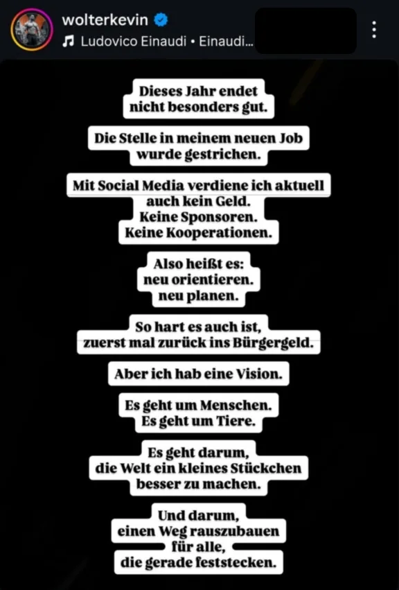Bis das funktioniert, lebt er erst einmal von Bürgergeld: „Dieses Jahr endet nicht besonders gut. Die Stelle in meinem neuen Job wurde gestrichen. Mit Social Media verdiene ich aktuell auch kein Geld. (…) So hart es auch ist, zuerst mal zurück ins Bürgergeld.“