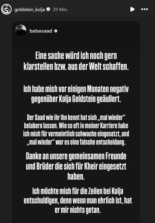 „Eine Sache würde ich noch gern klarstellen, bzw. aus der Welt schaffen. Ich habe mich vor einigen Monaten negativ gegenüber Kolja Goldstein geäußert. Der Saad wie ihr ihn kennt, hat sich mal wieder belabern lassen. Wie so oft in meiner Karriere habe ich mich für vermeintlich schwache eingesetzt. Und mal wieder war es eine falsche Entscheidung. Danke an unsere gemeinsamen Freunde und Brüder, die sich für Kheir eingesetzt haben. Ich möchte mich für die Zeilen bei Kolja entschuldigen, denn wenn man ehrlich ist, hat er mir nichts getan.“