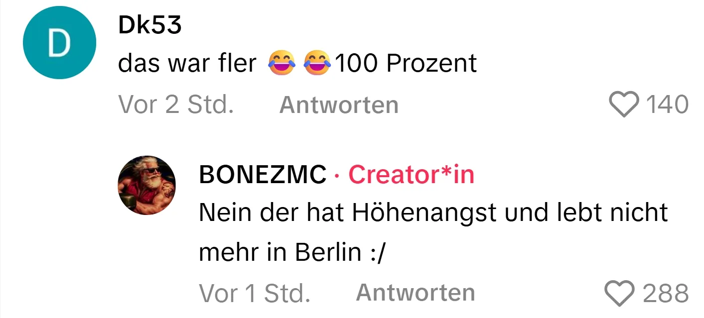 Und auch die Fans haben bereits einige Theorien über die möglichen Täter aufgestellt. Auf Tiktok geht so das Gerücht herum, dass Fler hinter der Graffiti-Attacke stecken soll. Bonez widerspricht und meint, dass dieser nicht mehr in Deutschland lebe und „Höhenangst“ habe. Das ist faktisch richtig und wurde von Fler selbst schon mehrfach erklärt. Aus diesem Grund verzichtet er fast vollständig auf Flugreisen.