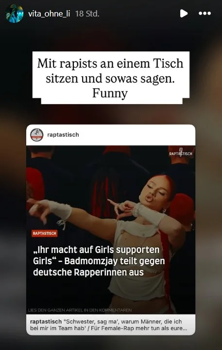 Mit Bezug auf die oben erwähnten Zeilen findet Vita es „funny“, dass Badmomzjay parallel dazu „mit rapists an einem Tisch“ sitze. Also im Klartext: Vita wirft Badmomzjay vor, mit Vergewaltigern cool zu sein. Viel konkreter wird sie mit dieser ernsthaften Anschuldigung nicht.