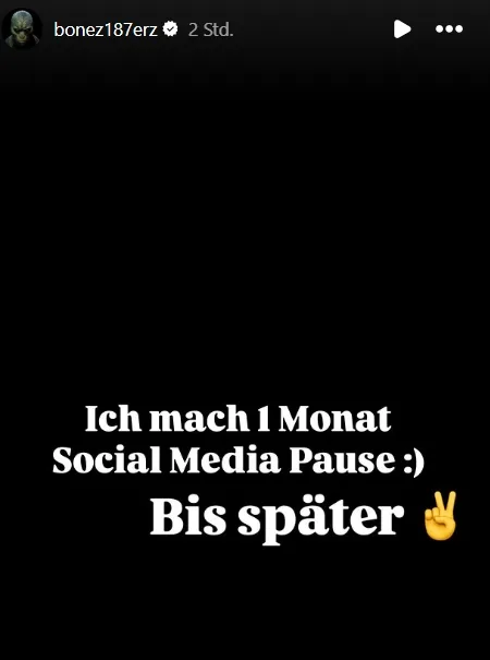 Innerhalb von zwei Monaten hat Bonez also wieder eine ganze Menge erlebt und gemacht. Und anscheinend reicht ihm das schon wieder aus. Vor wenigen Minuten teilte der 187 Strassenbande-Rapper vollkommen überraschend mit, dass er sich wieder eine Auszeit nimmt.