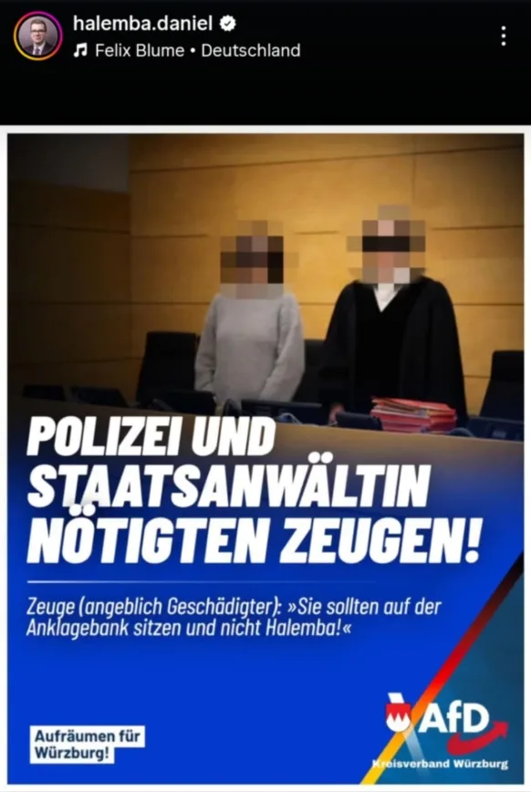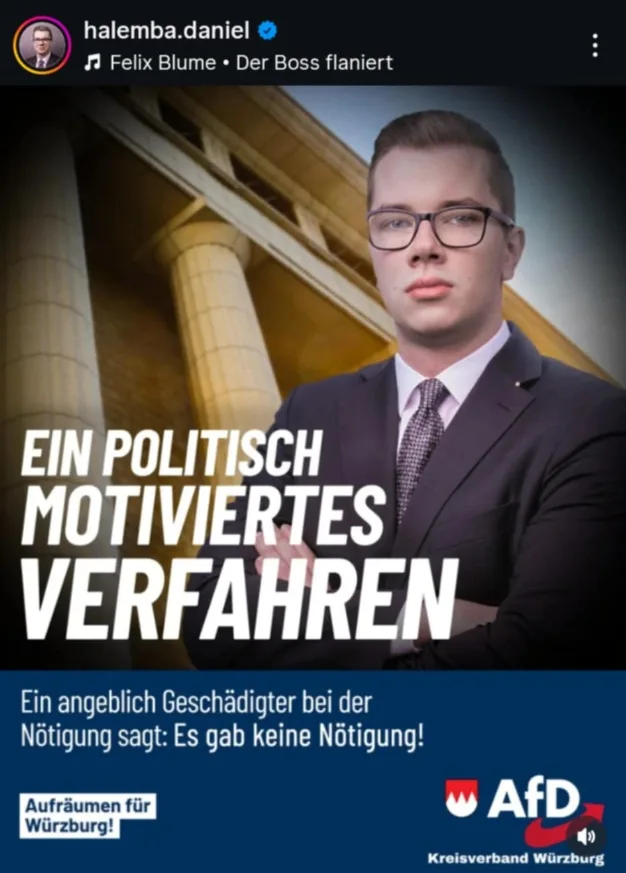 Der bayrische Landtagsabgeordnete Daniel Halemba wurde jüngst zu einer Geldstrafe von 51.600 Euro wegen Nötigung und Volksverhetzung verurteilt. Er selbst bezeichnet das Verfahren als politisch motiviert und verbreitet dazu Instagram-Beiträge, in denen er zuletzt sehr oft die Songs von Kollegah genutzt hat und sich als eine Art „Nachwuchsboss“ inszeniert.