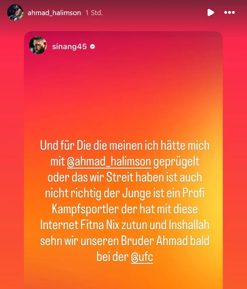 „Und für die die meinen, ich hätte mich mit Ahmad Halimson geprügelt oder dass wir streit haben: Ist auch nicht richtig. Der Junge ist ein Profi-Kampfsportler, der hat mit diese Internet-Fitna nichts zutun und Inshallah sehen wir unseren Bruder Ahmad bald bei der UFC.“