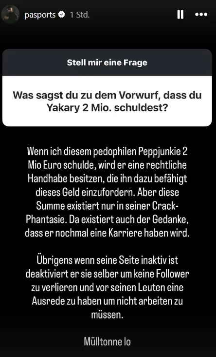 „Wenn ich diesem pädophilen Pep-Junkie 2 Millionen Euro schulde, wird er eine rechtliche Handhabe besitzen, die ihn dazu befähigt, dieses Geld einzufordern. Aber diese Summe existiert nur in seiner Crack-Fantasie. Da existiert auch der Gedanke, dass er nochmal eine Karriere haben wird. Übrigens, wenn seine Seite inaktiv ist, deaktiviert er sie selber um keine Follower zu verlieren und vor seinen Leuten eine Ausrede zu haben, um nicht arbeiten zu müssen. Mülltonne lo.