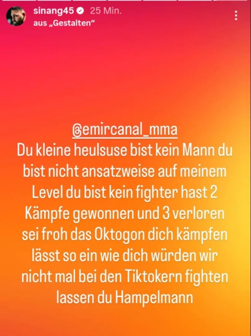„Emir-Can Al, du kleine Heulsuse bist kein Mann. Du bist nicht ansatzweise auf meinem Level du bist kein Fighter. Hast 2 Kämpfe gewonnen und 3 verloren, sei froh dass Oktagon dich kämpfen lässt. So ein wie dich würden wir nicht mal bei den Tiktokern fighten lassen du Hampelmann.“