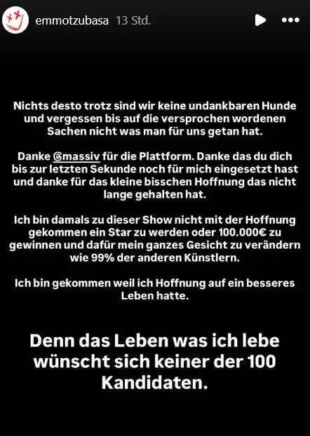 Jetzt hat Emmo Tzubasa auf diese Entscheidung reagiert und seinerseits mit den Juroren von Prototyp Rapstar abgerechnet. Er bedankt sich bei Massiv für die Chance und dass er sich bis zuletzt für ihn eingesetzt habe. Die anderen hätten ihm jedoch „in den Rücken gestochen“, vermutlich insbesondere mit Bezug auf Pa Sports. Der LiP-Chef hatte jüngst schlechte Erfahrungen mit unberechenbaren Signings. Dementsprechend ist davon auszugehen, dass er große Bedenken bzgl. Emmo Tzubasa hatte:
