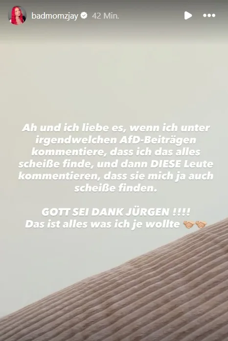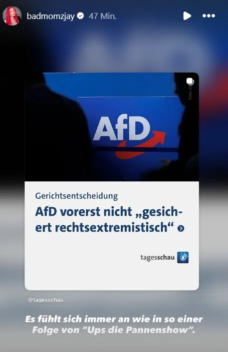 Und auch Badmomzjay hat sich jetzt klar gegen die Partei von Rechtsaußen positioniert und sich dafür bedankt, dass sie nicht von den Wählern der AfD gefeiert wird. Sie reagierte auf einen News-Beitrag zu einem aktuellen Gerichtsurteil.