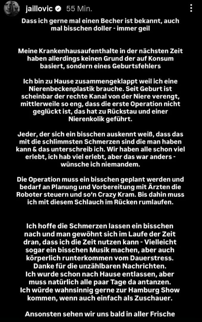 In der Nacht auf den 25. Februar musste der Hamburger Rapper Jaill notoperiert werden. Der 29-Jährige meldete sich einige Stunden nach der OP aus dem Krankenhaus und teilte mit, dass seine rechte Niere kollabiert ist. Für gut 6 Wochen muss Jaill sich nun schonen und zusätzlich einen Schlauch im Rücken tragen, der die Niere entlastet.