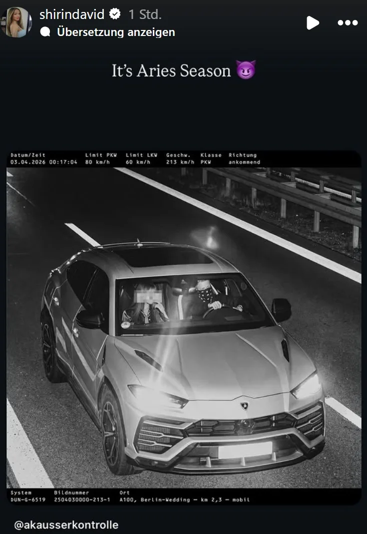 Bereits vor zwei Tagen teilte AK Ausserkontrolle ein Blitzerfoto auf seinem Profil, auf dem wir den Rapper zusammen mit einer – bis jetzt – unbekannten Frau im Lamborghini Urus sehen. Mit 213 Sachen sind die beiden in einer 80er-Zone zu sehen. Nun ist klar, um wen es sich bei seiner weiblichen Begleitung handelt.