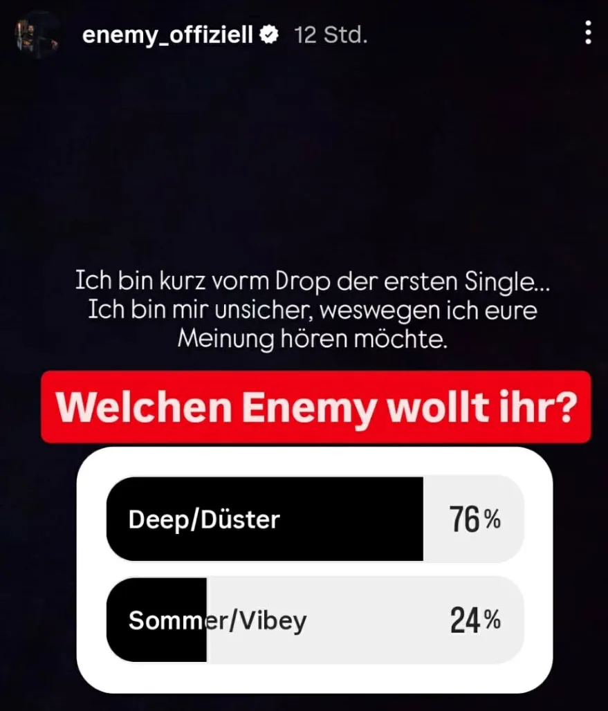 Er fragt seine Fans, welche Richtung er für sein Comeback einschlagen soll. Und obwohl seine Rückkehr eigentlich ein Grund zur Freude sein sollte, wollen seine Fans den klassischen Enemy: 76% stimmen für deep, düster und introspektiv. Auch wenn der Song vermutlich nicht besonders fröhlich sein wird: Schön, dass Enemy wieder da ist!
