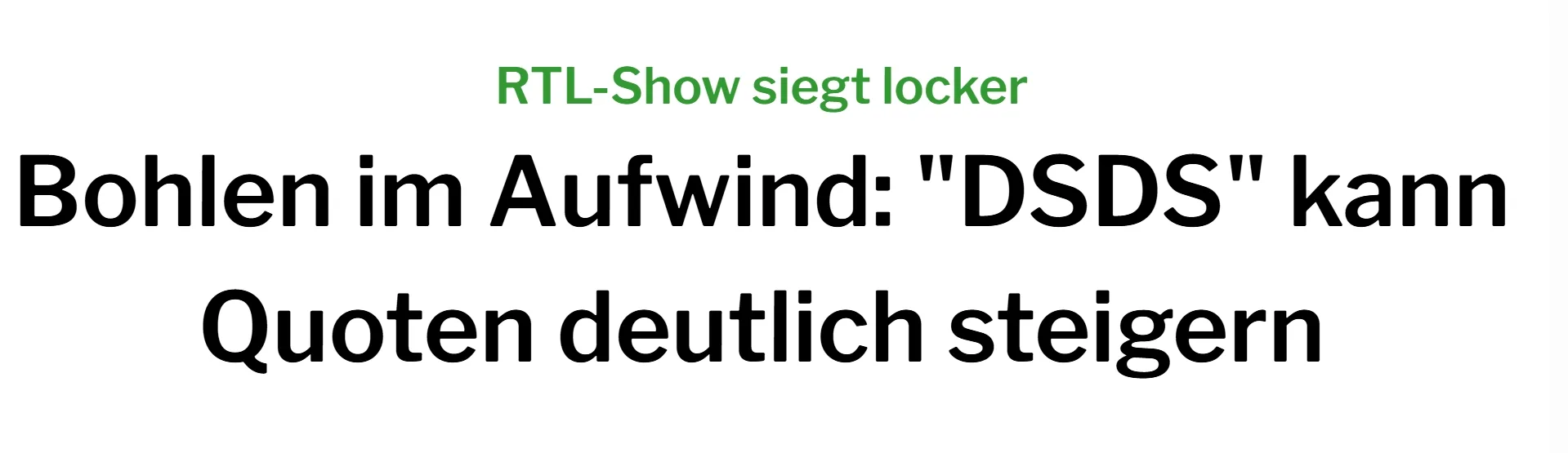 „Deutschland sucht den Superstar“ hat sich am Dienstag ein ganzes Stück besser geschlagen als beim Staffel-Auftakt am vorigen Samstag. Durchschnittlich 1,80 Millionen Zuschauerinnen und Zuschauer schalteten im Schnitt ab 20:15 Uhr ein. (…) 13,5 Prozent – ein überzeugendender Wert für den Kölner Sender, der damit in der Primetime als Marktführer hervorging. Bei den 14- bis 59-Jährigen erzielte die Show ebenfalls 13,5 Prozent. Auch das reichte, um sich an die Spitze zu setzen.“ (Quelle: DWDL)
