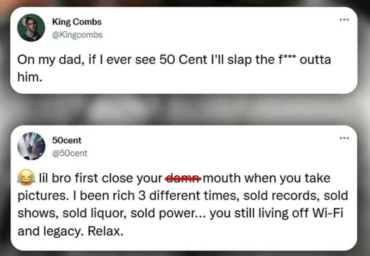 Der Sohn von Diddy hat seinen Hass auf 50 Cent öffentlich gemacht und erklärt, dass er den Rapper aus Queens zusammenschlagen würde, wenn er ihn jemals sehen sollte: „Ich schwöre auf meinen Vater, wenn ich 50 Cent jemals zu Gesicht bekomme, werde ich die Scheiße aus ihm herausprügeln.“