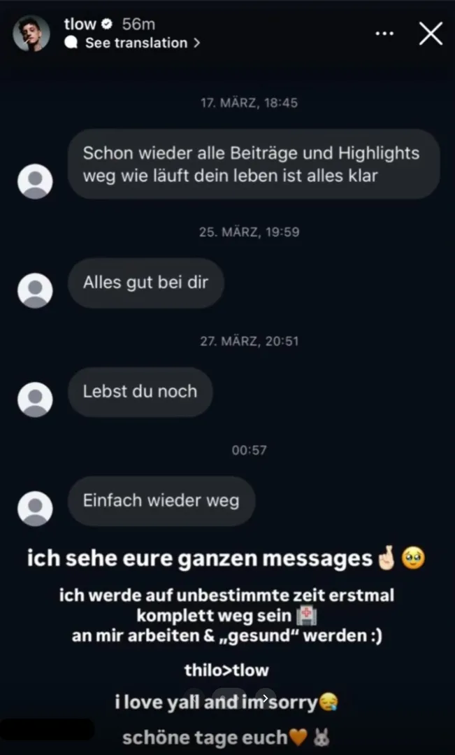 Das Krankenhaus-Emoji in seiner Nachricht deutet darauf hin, dass er sich in eine Suchtklinik begibt und dort erst einmal versucht, von seiner Sucht loszukommen. Er will „Thilo“ wieder über „T-Low“ stellen: „Ich sehe eure ganzen Messages. Ich werde auf unbestimmte Zeit erstmal komplett weg sein, an mir arbeiten und „gesund“ werden. Thilo > T-Low. I love y’all and I’m sorry. Schöne Tage euch.“