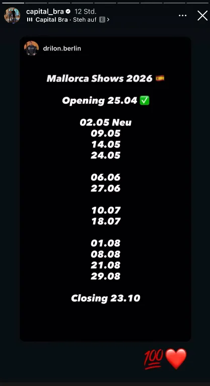 Damit spannt Capital Bra den Bogen von der Saisoneröffnung bis zum Closing und positioniert sich über Monate fest im Programm. Die Botschaft: Statt kurzfristiger Gastspiele plant das Team eine komplette Saisonstrategie. Für Clubs, Veranstalter und Fans entsteht eine klare Taktung mit festen Daten. Der Schritt folgt unmittelbar auf die Debatte um Rap am Ballermann und unterstreicht, dass die Rap-Fraktion 2026 auf Mallorca fest eingeplant ist.